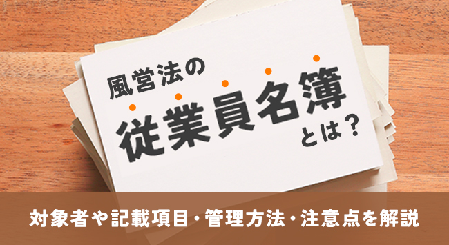 風営法では、風俗営業や性風俗関連特殊営業を行う事業者に対し、従業員名簿の作成と備え置きが義務付けられています。従業者名簿には住所・氏名のほか性別、生年月日、採用年月日、退職年月日、従事する業務の内容を記載し、接客従業者の確認は風営法36条の2に基づき別途記録・保存します。